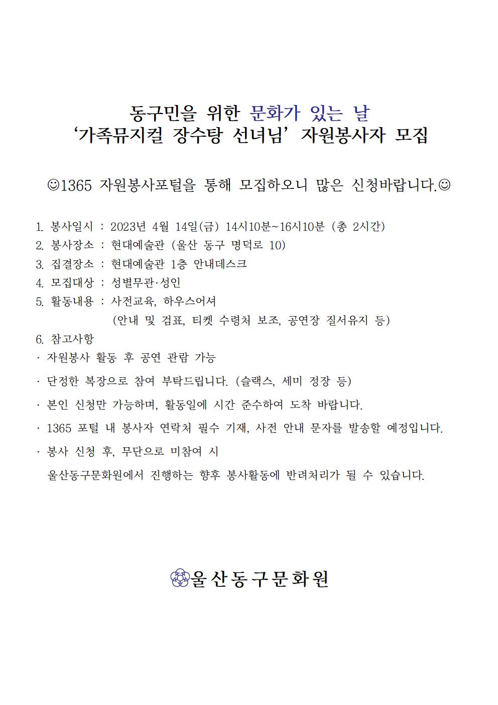 '가족뮤지컬 장수탕 선녀님' 자원봉사자 모집 안내