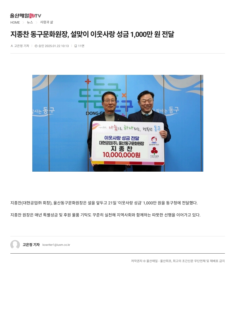 다음글 [경상일보] 설맞이 이웃사랑 성금 1000만원 동구에 기탁