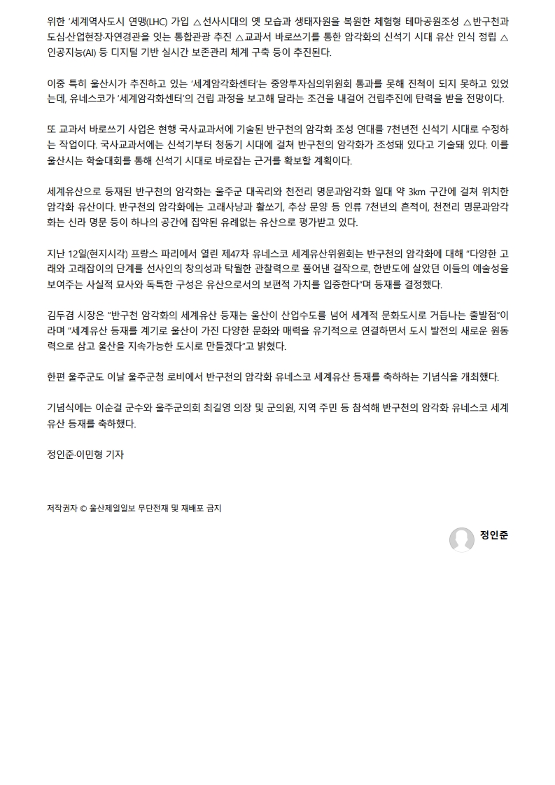다음글 [경상일보] 김두겸 울산시장, 세계유산 등재 성과 안고 귀국…울산공항서 환영식 열려