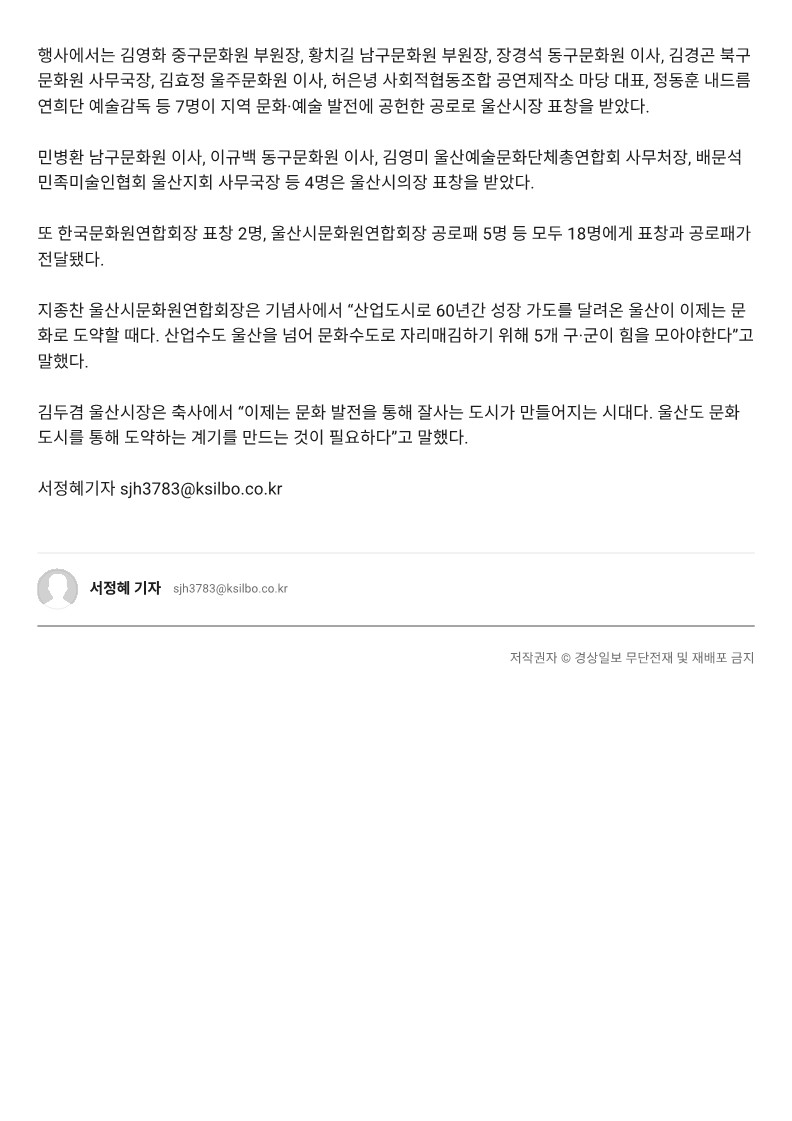 다음글 [울산매일] 김두겸 시장 "울산시민 양질의 문화예술 향유위해 최선"